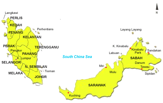 Malaysia, comprising the states of Sabah and Sarawak, stretches along the