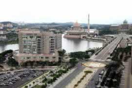 view of Putrajaya. Landscaped with trees and water fountains; there are
